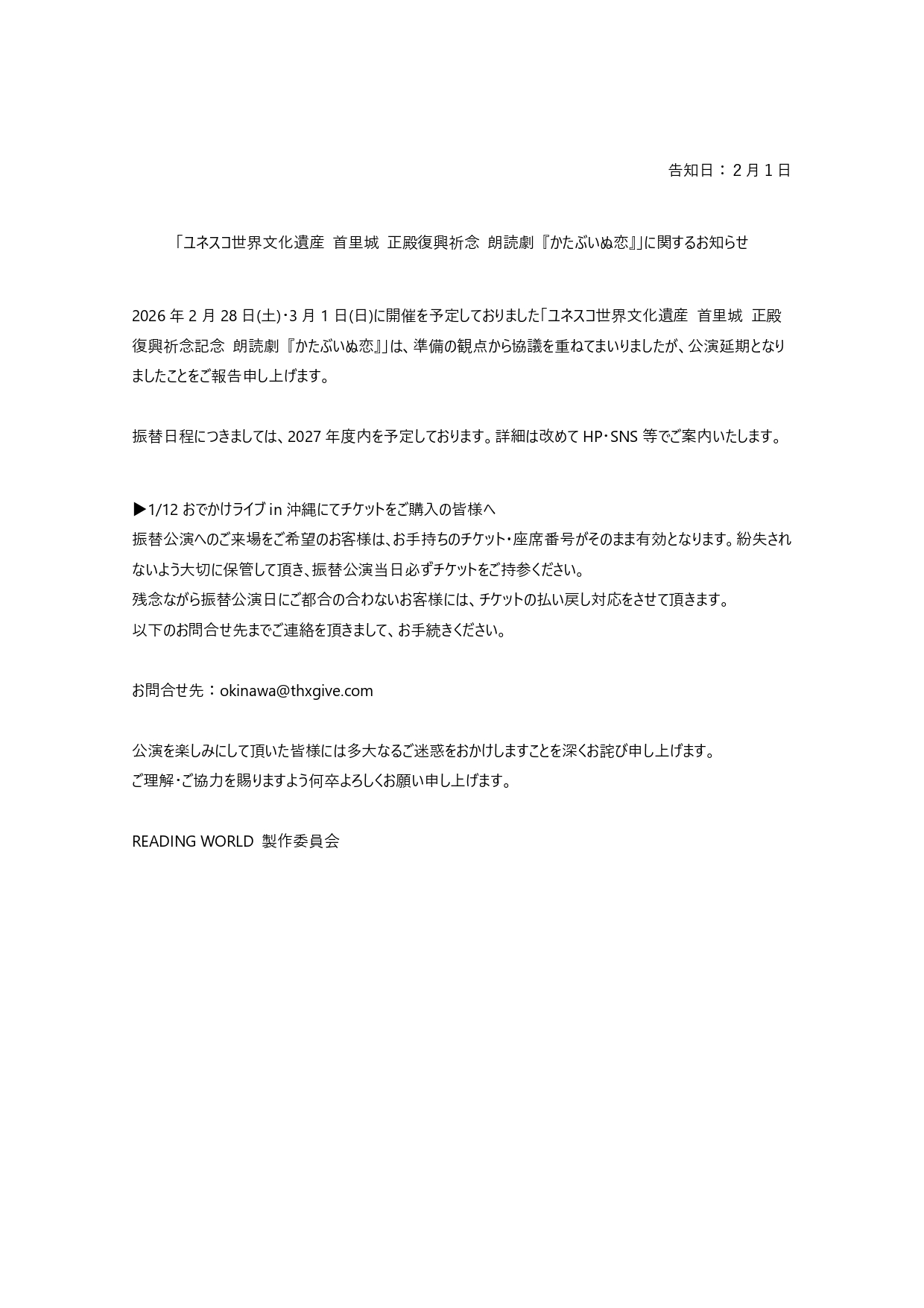 「ユネスコ世界文化遺産 首里城 正殿復興祈念 朗読劇 『かたぶいぬ恋』」に関するお知らせ